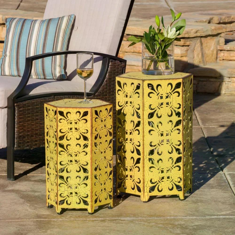 Looking to liven up your living space? Then look no further than the Wayne Iron Accent Tables, available in select colors. These stylish tables are sure to get the conversation flowing and intrigue all of your guests as to which antique store you must have gotten it from. The intricate patterning of the fleur-de-lis on the tables gives them an air of history, as if they were taken straight out of French history.Includes: Two (2) Accent TablesMaterials: IronColor: Antique YellowNo Assembly RequiredTable One Dimensions: 14.25 inches deep x 12.50 inches wide x 22.00 inches highTable Two Dimensions: 12.00 inches deep x 10.50 inches wide x 18.25 inches high"